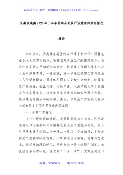 / 区委政法委2025年上半年落实全面从严治党主体责任情况报告