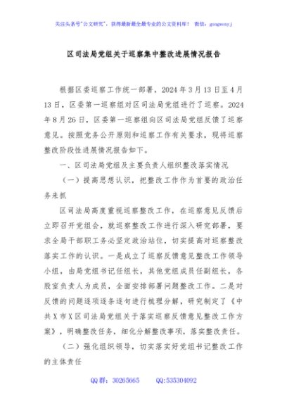 / 区司法局党组关于巡察集中整改进展情况报告