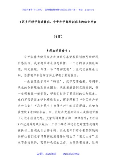 / (4篇)X区乡科级干部进修班、中青年干部培训班上的结业发言
