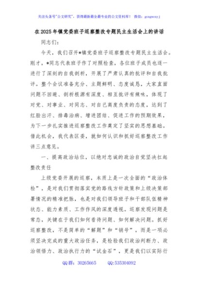 / 在2025年镇党委班子巡察整改专题民主生活会上的讲话