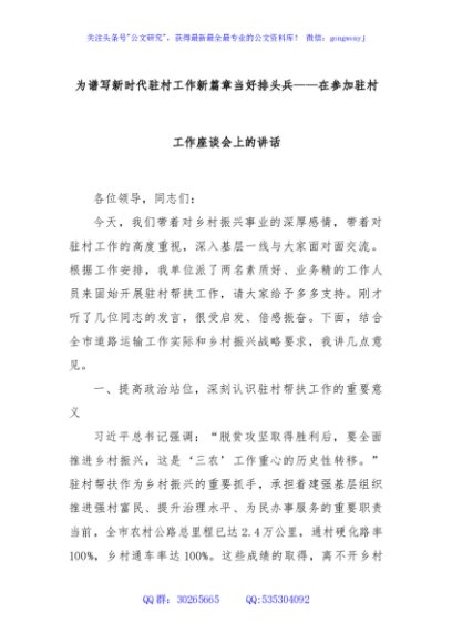 / 为谱写新时代驻村工作新篇章当好排头兵——在参加驻村工作座谈会上的讲话