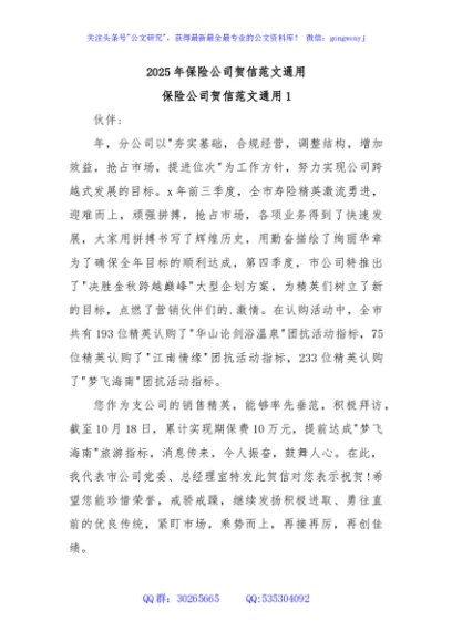 / 2025年保险公司贺信范文通用