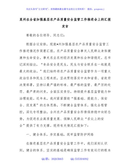 / 某州在全省加强基层农产品质量安全监管工作推进会上的汇报发言