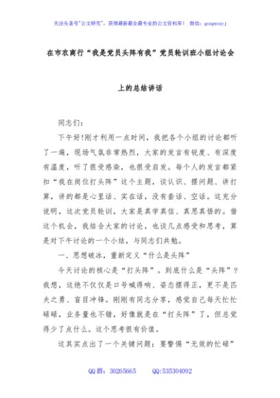 / 在市农商行“我是党员头阵有我”党员轮训班小组讨论会上的总结讲话