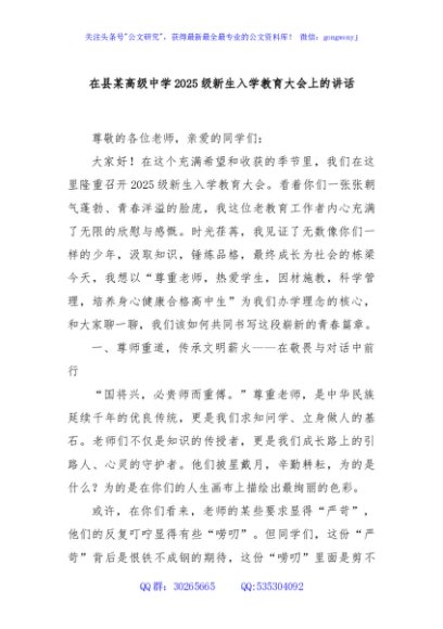 / 在县某高级中学2025级新生入学教育大会上的讲话