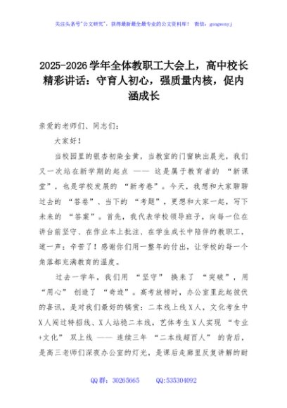 2025-2026学年全体教职工大会上,高中校长精彩讲话:守育人初心,强质量内核,促内涵成长
