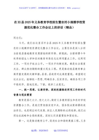 / 在XX县2025年义务教育学校招生暨农村小规模学校资源优化整合工作会议上的讲话(精品)