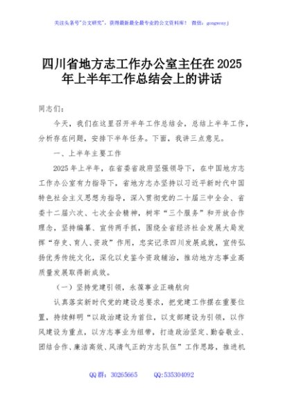 / 四川省地方志工作办公室主任在2025年上半年工作总结会上的讲话