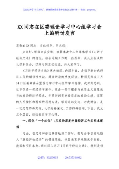 / XX同志在区委理论学习中心组学习会上的研讨发言