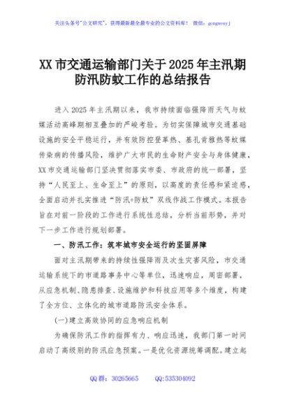 / XX市交通运输部门关于2025年主汛期防汛防蚊工作的总结报告