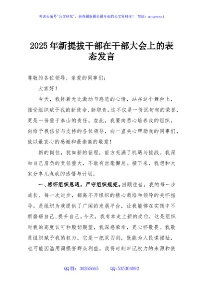/ 2025年新提拔干部在干部大会上的表态发言
