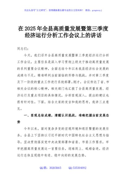 / 在2025年全县高质量发展暨第三季度经济运行分析工作会议上的讲话