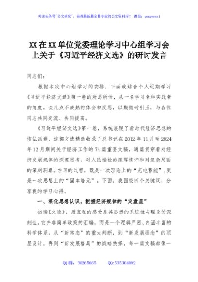 / XX在XX单位党委理论学习中心组学习会上关于《习近平经济文选》的研讨发言