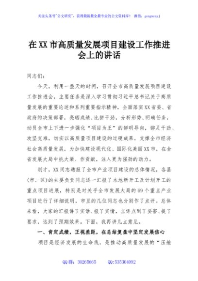 / 在XX市高质量发展项目建设工作推进会上的讲话