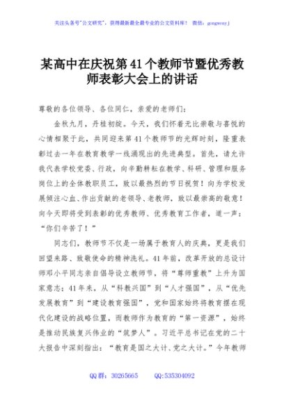 / 某高中在庆祝第41个教师节暨优秀教师表彰大会上的讲话