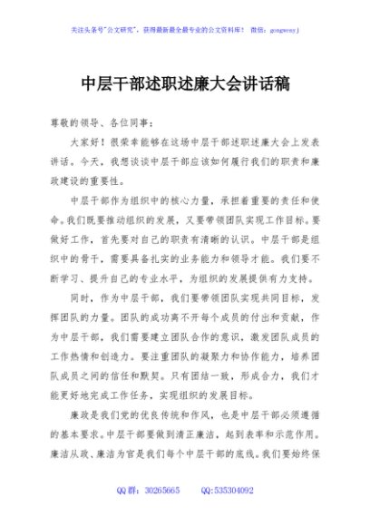 / 中层干部述职述廉大会讲话稿