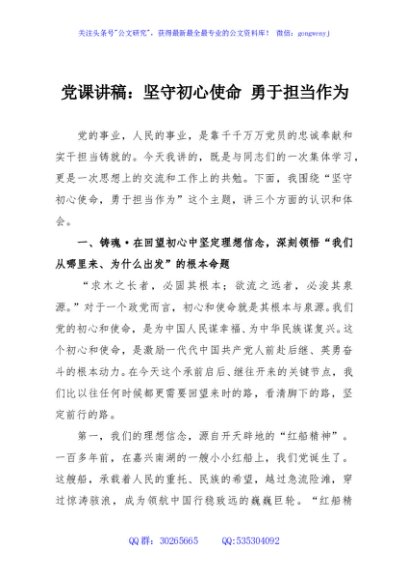 / 党课讲稿:坚守初心使命 勇于担当作为