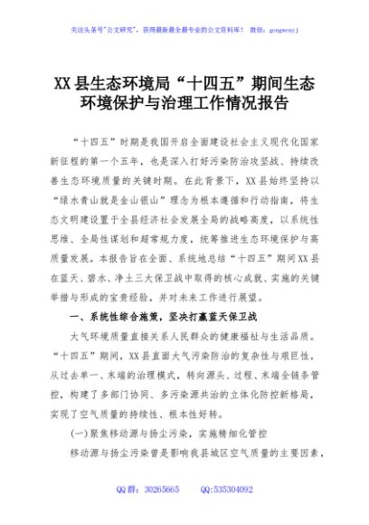 / XX县生态环境局“十四五”期间生态环境保护与治理工作情况报告