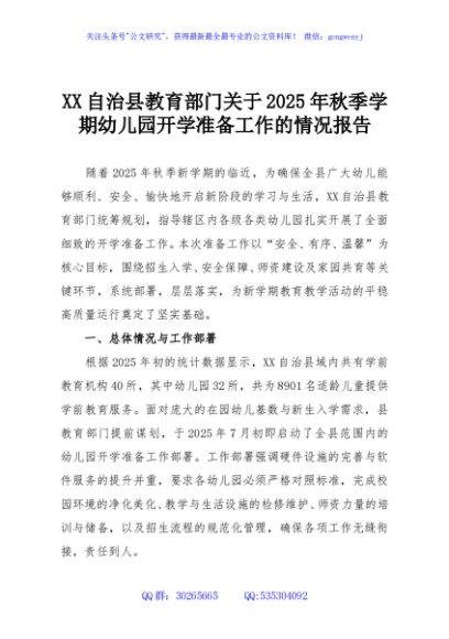 / XX自治县教育部门关于2025年秋季学期幼儿园开学准备工作的情况报告