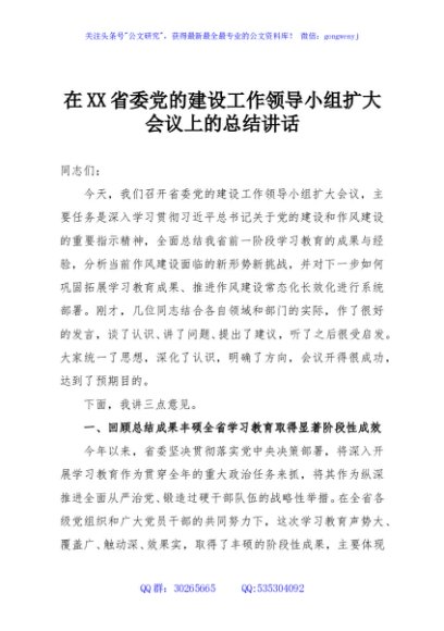 / 在XX省委党的建设工作领导小组扩大会议上的总结讲话