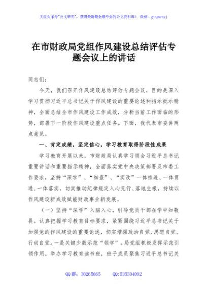 / 在市财政局党组作风建设总结评估专题会议上的讲话