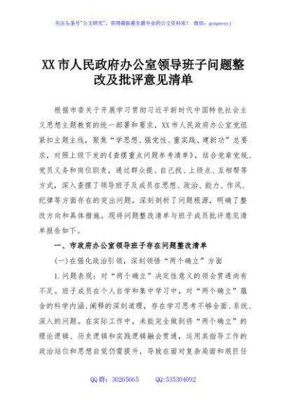 / XX市人民政府办公室领导班子问题整改及批评意见清单