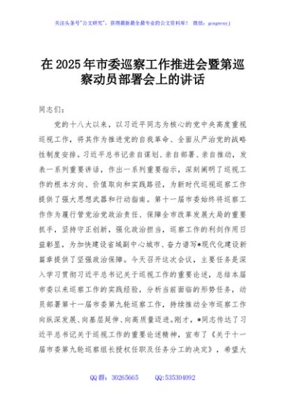 / 在2025年市委巡察工作推进会暨第巡察动员部署会上的讲话