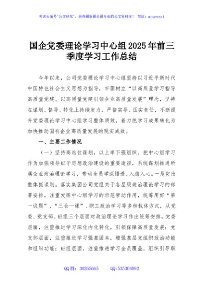 / 国企党委理论学习中心组2025年前三季度学习工作总结