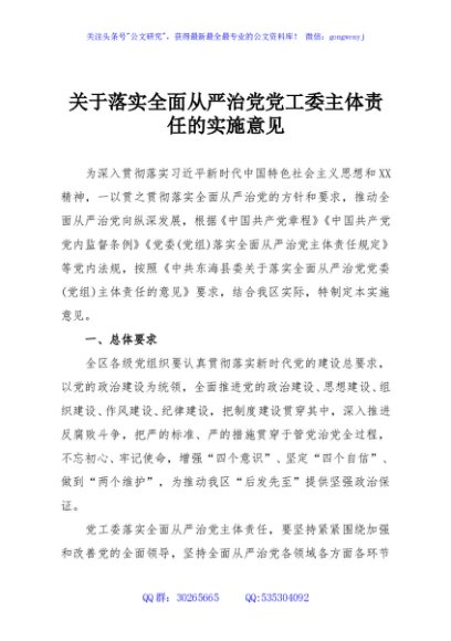 / 关于落实全面从严治党党工委主体责任的实施意见