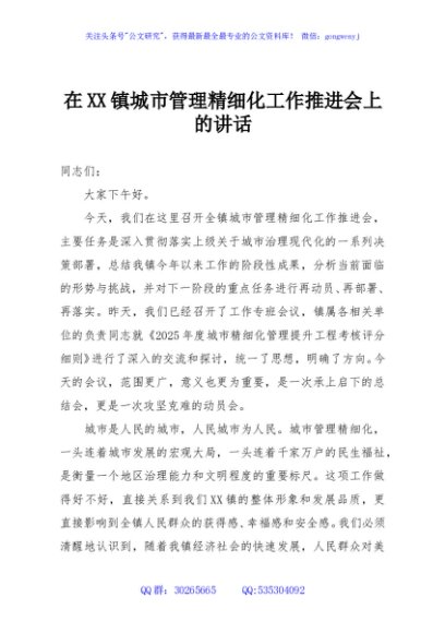 / 在XX镇城市管理精细化工作推进会上的讲话