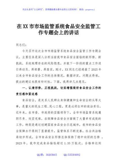 / 在XX市市场监管系统食品安全监管工作专题会上的讲话