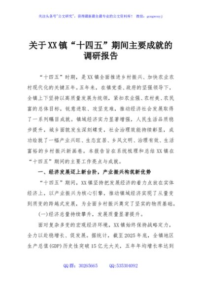 / 关于XX镇“十四五”期间主要成就的调研报告