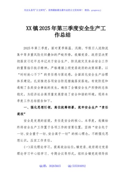 / XX镇2025年第三季度安全生产工作总结