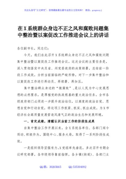 / 在X系统群众身边不正之风和腐败问题集中整治暨以案促改工作推进会议上的讲话