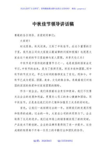中秋佳节领导讲话稿