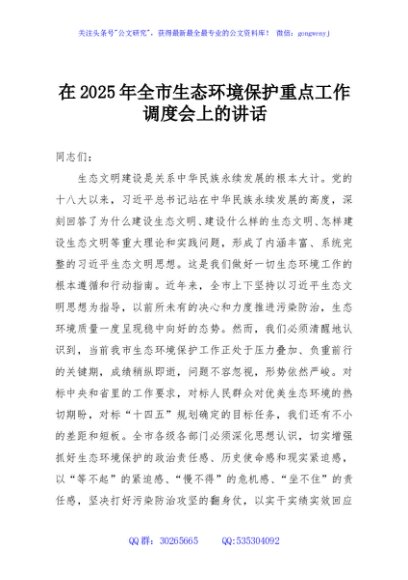 / 在2025年全市生态环境保护重点工作调度会上的讲话