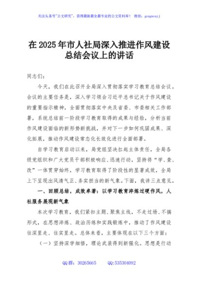 / 在2025年市人社局深入推进作风建设总结会议上的讲话
