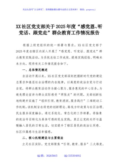 / XX社区党支部关于2025年度“感党恩、听党话、跟党走”群众教育工作情况报告