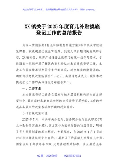 / XX镇关于2025年度育儿补贴摸底登记工作的总结报告