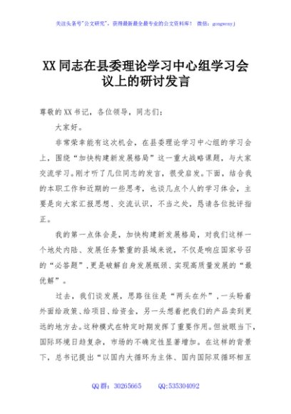 / XX同志在县委理论学习中心组学习会议上的研讨发言