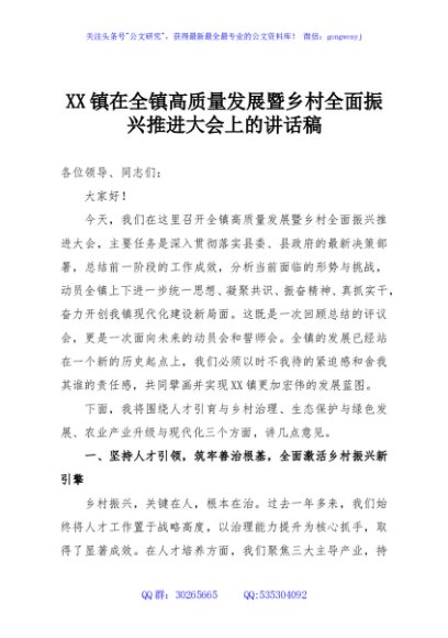 / XX镇在全镇高质量发展暨乡村全面振兴推进大会上的讲话稿