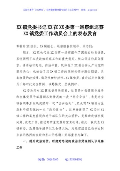 / XX镇党委书记XX在XX委第一巡察组巡察XX镇党委工作动员会上的表态发言