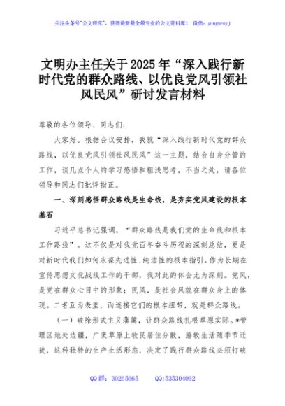 / 文明办主任关于2025年“深入践行新时代党的群众路线、以优良党风引领社风民风”研讨发言材料