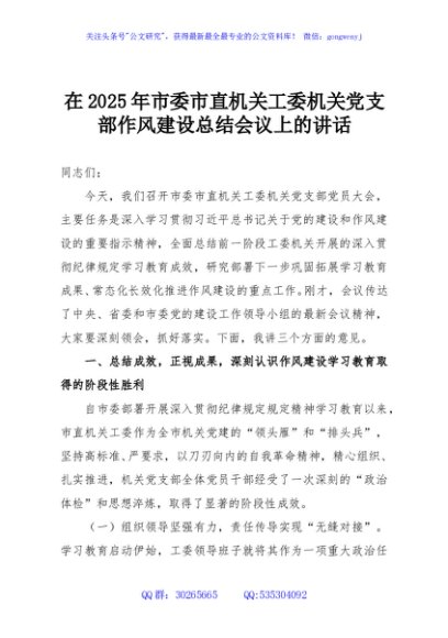 / 在2025年市委市直机关工委机关党支部作风建设总结会议上的讲话