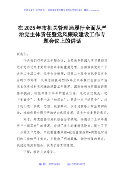 / 在2025年市机关管理局履行全面从严治党主体责任暨党风廉政建设工作专题会议上的讲话