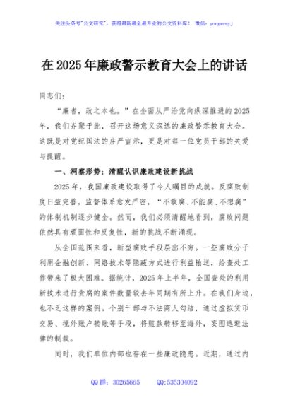 / 在2025年廉政警示教育大会上的讲话