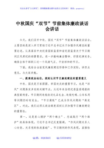/ 中秋国庆“双节”节前集体廉政谈话会讲话