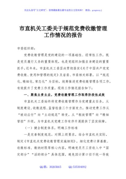 / 市直机关工委关于规范党费收缴管理工作情况的报告