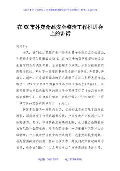 / 在XX市外卖食品安全整治工作推进会上的讲话