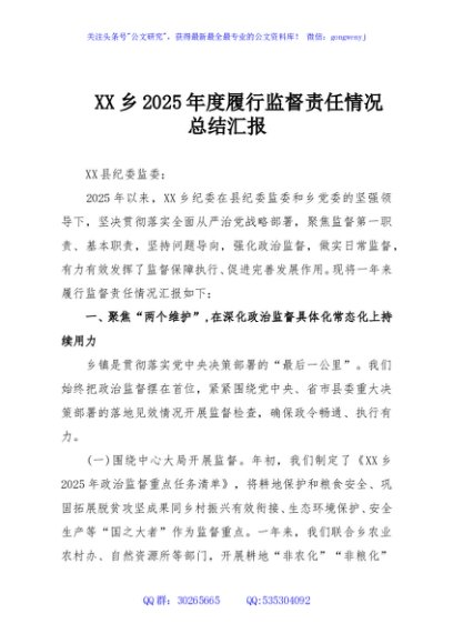 / XX乡2025年度履行监督责任情况总结汇报